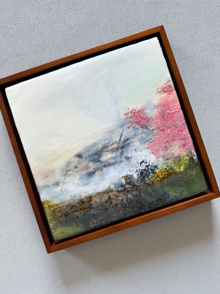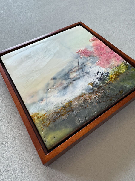 Encaustic mixed media on 3/4" wood panel. Solid wood frame in a walnut finish. Wired and ready to hang. Contact for pricing.