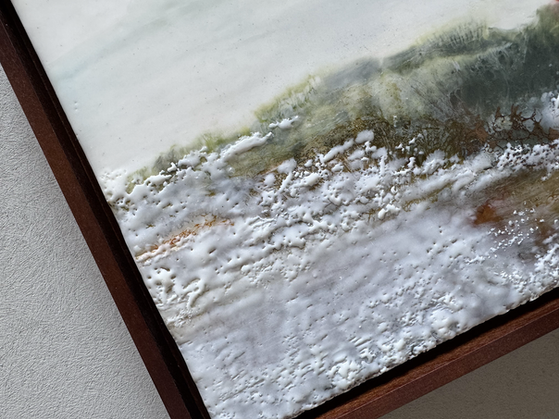 Encaustic mixed media on 3/4" wood panel. Solid wood float frame in a walnut finish. Wired and ready to hang. Contact for pricing.